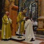 Così il pomeriggio domenicale ha radunato all’interno della Cattedrale i familiari giunti dal paese nativo in diocesi di Sessa Aurunca assieme a diversi reatini, fra cui i parrocchiani di Vazia – in testa il parroco don Zdenek, cui è toccato, nell’apposito momento del rito, presentare Marcello rispondendo al vescovo circa il suo essere idoneo ad accedere all’ordine del diaconato – che è la comunità in cui Marcello svolge da un paio di anni il tirocinio pastorale, vari fedeli di Petrella Salto e dintorni, che col parroco don Felice hanno accompagnato il suo passaggio dal lavoro di farmacista in paese all’ingresso in seminario, e altri ancora. Non mancavano ovviamente i ministranti che, sotto la sua guida di cerimoniere, sono soliti svolgere servizio liturgico nelle celebrazioni vescovili, e che erano presenti al completo nel servire all’altare in questa liturgia in cui stavolta Marcello si trovava a pronunciare l’impegno di servire il Signore nel sacramento dell’ordine, per ora nel primo gradino che è il diaconato. Né mancava il coro diocesano, per l’occasione rimpolpato anche dai cantori della parrocchia di Vazia, ad animare la solenne celebrazione.